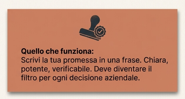 Quello che funziona: scrivi la tua promessa in una frase. Chiara, potente, verificabile. Deve diventare il filtro per ogni decisione aziendale.
