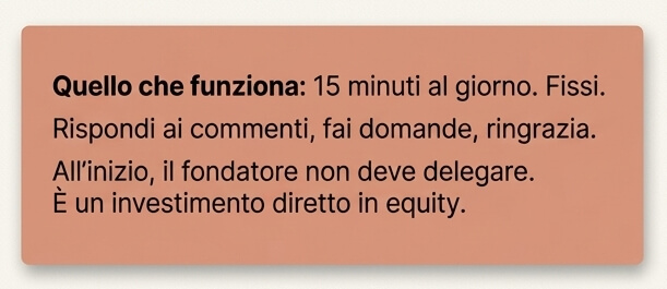 Quello che funziona: 15 minuti al giorno. Fissi. Per interagire con il pubblico. Rispondi ai commenti, fai domande, ringrazia per i feedback. All'inizio non delegare. Quel tempo è investimento diretto in equity.