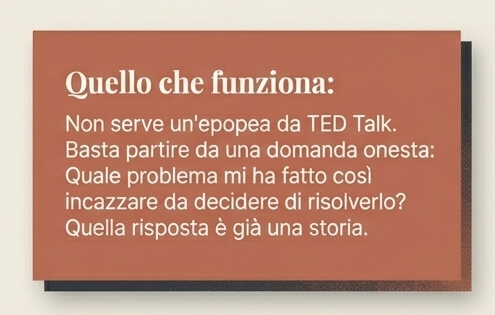 Quello che funziona: non serve un'epopea da TED Talk. Basta partire da una domanda onesta: quale problema mi ha fatto così incazzare da decidere di risolverlo? Quella risposta è già una storia.
