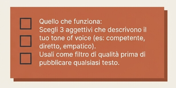 Quello che funziona: scegli tre aggettivi che descrivono il tuo tone of voice (esempio: competente, diretto, empatico). Prima di pubblicare qualsiasi testo, chiediti se rispecchia questi tre attributi. Funziona come filtro di qualità.