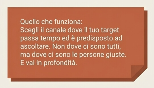 Quello che funziona: scegli il canale dove il tuo pubblico target passa tempo ed è predisposto ad ascoltare. Non dove "ci sono tutti", ma dove ci sono le persone giuste. E vai in profondità.