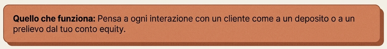 Quello che funziona: pensa ogni interazione con un cliente come deposito o prelievo dal tuo conto equity. Email risposta veloce? Deposito. Prodotto che mantiene la promessa? Deposito. Commento negativo ignorato? Prelievo pesante.