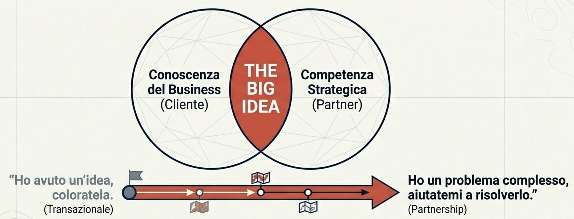 Il cliente che arriva con "ho avuto una grande idea, ora eseguitela" sta comprando esecuzione. Va bene, ma non è questo il modo in cui nascono i lavori migliori. La vera idea nasce dallo scambio tra la conoscenza del business che hai tu e la competenza strategica e creativa che ha il partner.