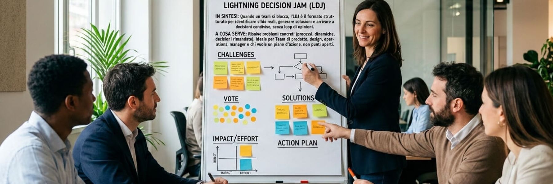 Quando un team si blocca su un problema e le discussioni tendono ad allargarsi senza portare da nessuna parte, il Lightning Decision Jam è il formato giusto. Una sessione strutturata per identificare sfide reali, generare soluzioni e arrivare a decisioni condivise, senza il rischio di finire in un loop di opinioni che si sovrappongono.