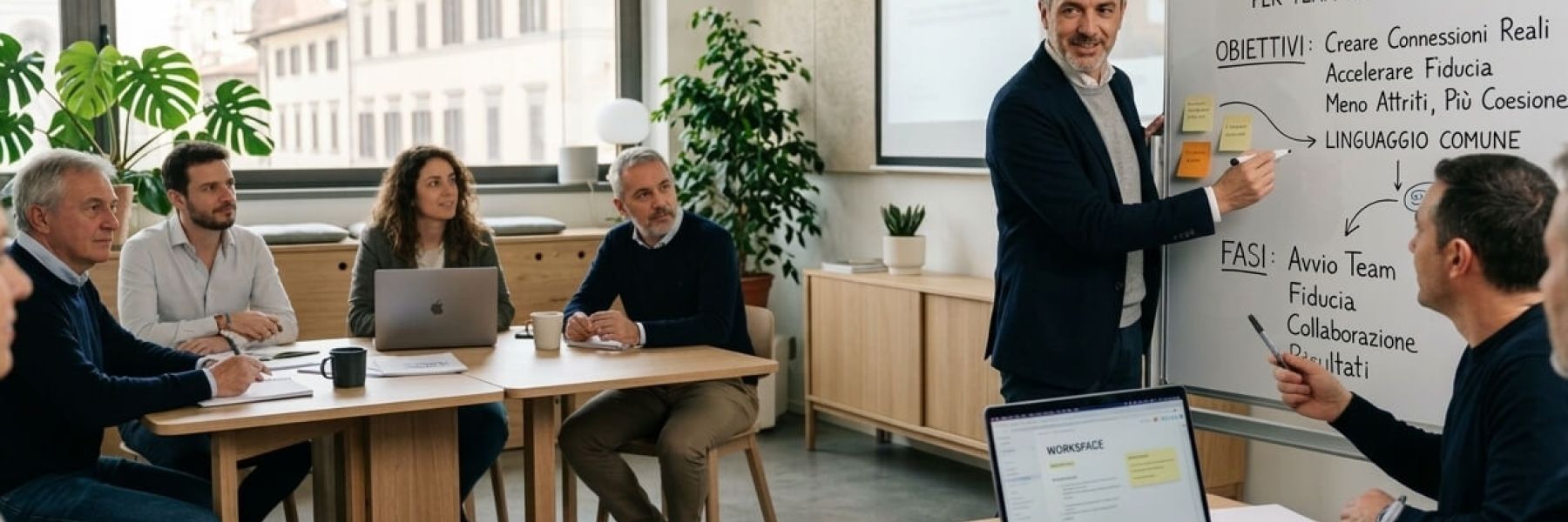 Non è un team building celebrativo né una giornata di attività. È una sessione di lavoro strutturata per capire cosa tiene insieme un team — e cosa lo rallenta. Si parte dalle persone, si arriva al metodo. Funziona nei momenti di avvio, ma anche quando la cooperazione interna scricchiola e serve rimettere ordine nelle relazioni di lavoro.